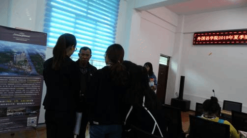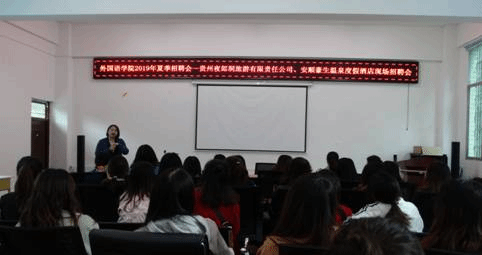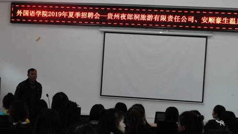 2019年5月8日下午3点,贵州夜郎洞旅游有限责任公司、安顺豪生温泉度假酒店针对安顺学院外国语学院毕业生的专场招聘会在安顺学院招聘大厅举行。出席本次招聘会的主要有贵州夜郎洞旅游有限责任公司罗经理、安顺豪生温泉度假酒店总经理Grace。