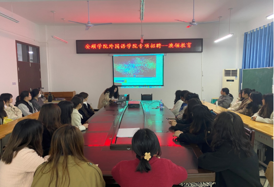 2023年2月28日上午10点30分,贵州澳领教育有限公司针对安顺学院外国语学院毕业生的专场招聘会在安顺学院外国语学院会议室举行。出席本次招聘会的主要有外国语学院党委书记刘碧芬、院长蒋燕、专职副书记张明莉、学生科副科长黄健及负责此次招聘的贵州澳领教育有限公司的唐总、罗桑校长和刘娟老师。