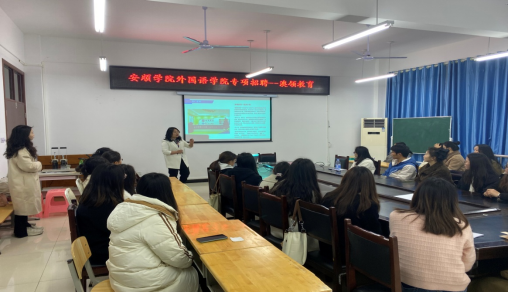 招聘会由此次负责职业专招的刘娟老师为外国语学院学生介绍关于教育行业的相关内容,以及向同学们介绍了贵州澳领教育有限公司所属品牌及其相关信息,并向同学们说明了公司所需岗位人员职位、职数及薪资待遇等.