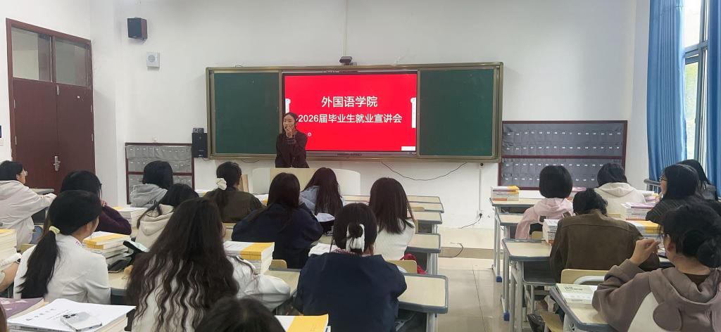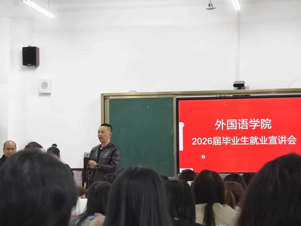 10月17日下午14:00,外国语学院在顺理楼开展了2026届毕业生就业宣讲,宣讲由外国语学院学生科黄健老师和辅导员樊信老师主讲,2026届英语专业毕业生全体参与。