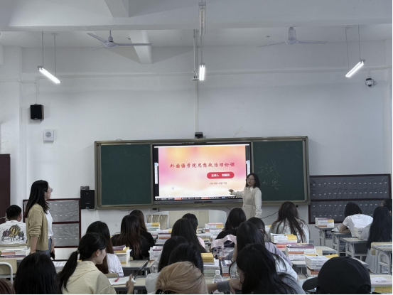 2025年10月17日下午,外国语学院党委书记刘碧芬在理综112教室为2024级英语专业学生讲授思想政治理论课。本次课程以《习近平谈治国理政》第五卷为主要学习内容,重点围绕“以中国式现代化全面推进中华民族伟大复兴”和“进一步全面深化改革 推进中国式现代化”两个专题展开。
